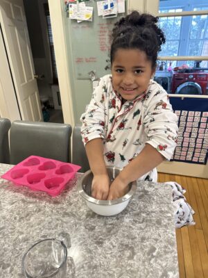 Pre-measured ingredients can keep things accessible, but I love to have kids practice measuring and pouring, and kids love packaging their finished creations to share with family.